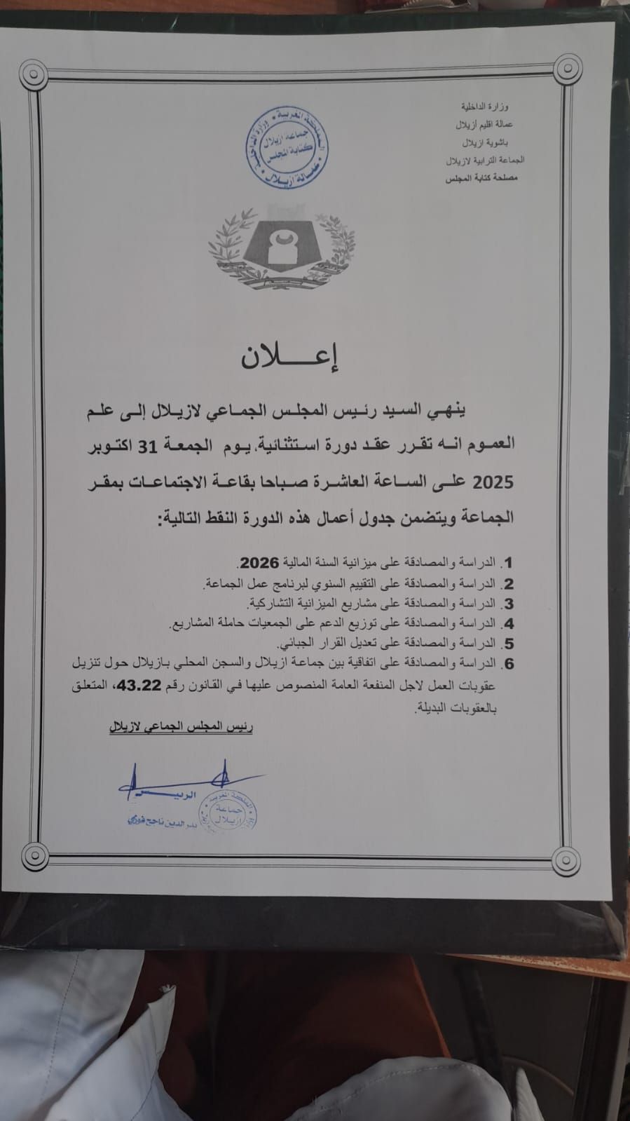 ينهي السيد رئيس المجلس الجماعي لازيلال إلى علم العموم انه تقرر عقد دورة استثنائية، يوم الجمعة 31 اكتوبر 2025 على الساعة العاشرة صباحا بقاعة الاجتماعات بمقر الجماعة ويتضمن جدول أعمال هذه الدورة النقط التالية: