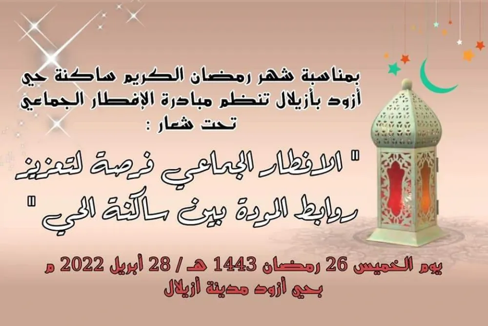 بمناسبة شهر رمضان الأبرك نظمت ساكنة حي أزود بأزيلال، يومه الخميس 26 رمضان، مبادرة حميدة للإفطار الجماعي تحت شعار لدالإفطار الجماعي فرصة لتعزيز روابط المودة بين ساكنة الحي. وبهذه المناسبة يهنئ رئيس المجلس الجماعي لأزيلال ساكنة الحي على هذه البادرة الحميدة التي تنم عن حسن الجوار والمؤازرة بين ساكنة الحي كما تمنى أن تسير باقي الأحياء على هذا النهج. ...