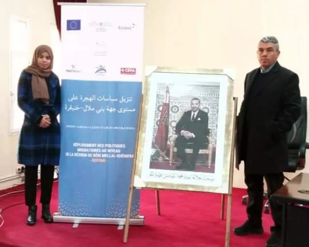 حضور السيد حدو أيت خويا نيابة عن رئيس المجلس الجماعي بأزيلال بمعية الآنسة حسناء بلخير عضوة المجلس الجماعي، أشغال ندوة علمية تحت عنوان "تنزيل سياسة الهجرة على مستوى جهة بني ملال.