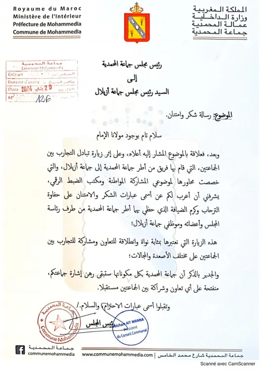 السيد بدر الدين ناجح فوزي رئيس المجلس الجماعي لأزيلال يتلقى رسالة شكر وامتنان من رئيس جماعة المحمدية